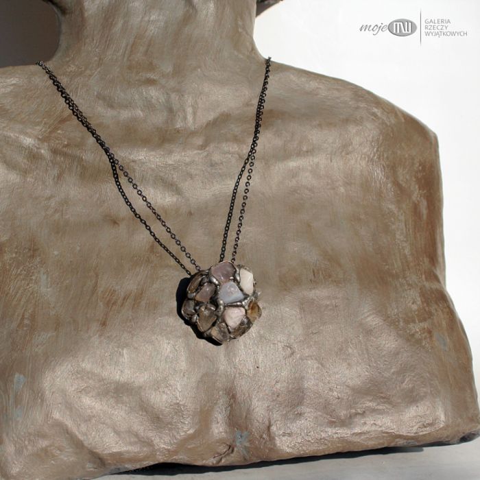 Wisiorek z naturalnych gładzonych kamieni - być może to kwarc i agat.