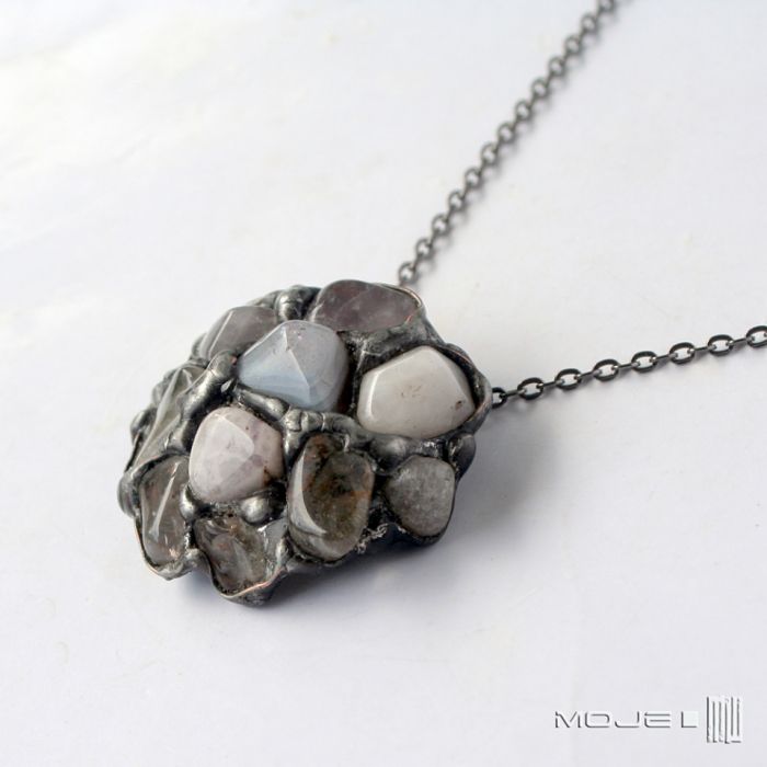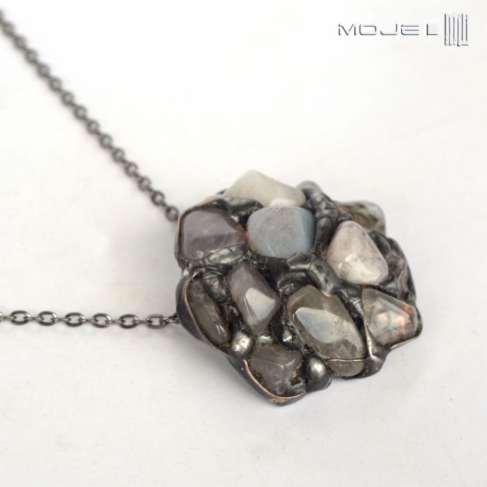 Kamienie oprawione są prosto w miedź pokrytą cyną, patynowaną na stare srebro i przecieraną. Wisior zawieszony jest na metalowym łańcuszku w kolorze grafitowym.