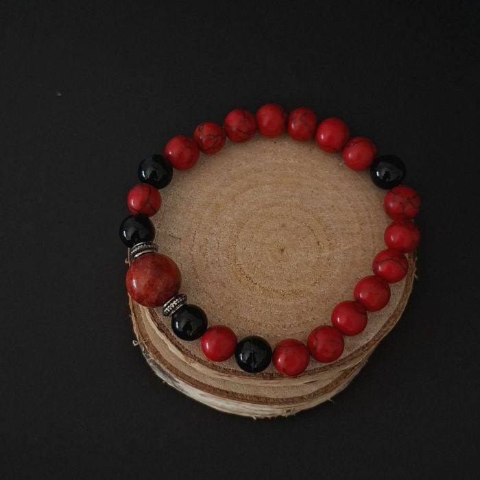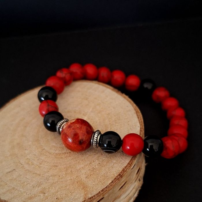 Kobieca bransoletka z kamieni w kolorze czerwieni i czerni. Klasyczna i elegancka. Powstała z korala, czarnego agatu i howlitów. Rozmiar uniwersalny.
