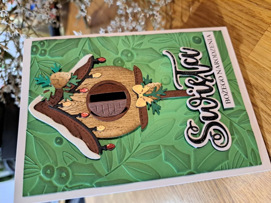 Kartka świąteczna bożonarodzeniowa, wykonana z wysokiej jakości papierów, z uroczym domkiem dla ptaszków, z otwieranymi drzwiczkami.