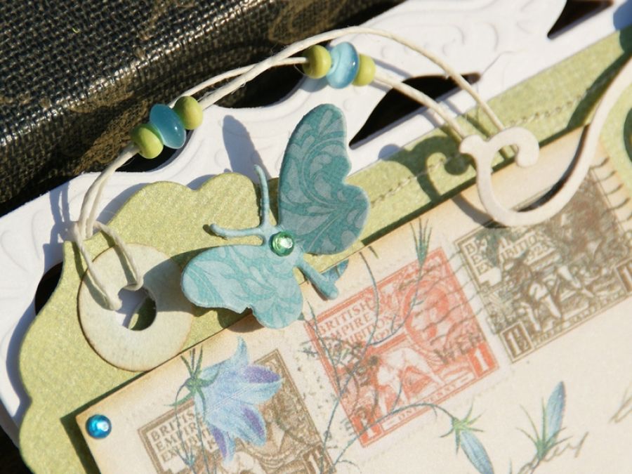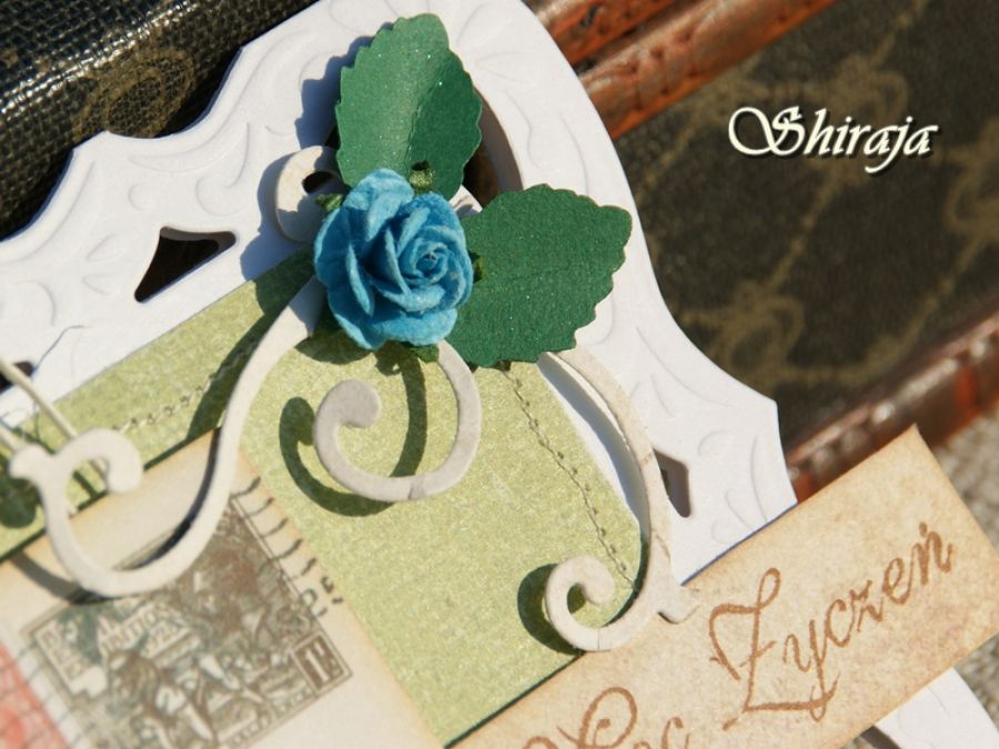 Wyjątkowa kartka w oryginalnym kształcie.Ozdobiona wysokiej jakości papierem do scrapbookingu. Uroku dodaje obrazek z motywem kwiatów, zielone i niebieskie koraliki oraz turkusowa róża.