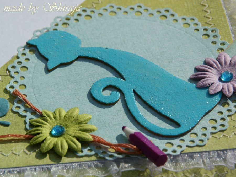 Wyjątkowa kartka w formie ozdobnej koperty . Wykonana z wysokiej jakości papierów do scrapbookingu. Ozdobiona maszynowymi przeszyciami, papierowymi kwiatuszkami, Uroku dodaje turkusowy kotek. W środku wkładka z życzeniami .Całość zapakowana dekoracyjnie w przeźroczystą folię, będzie pięknym dopełnieniem prezentu , lub upominkiem samym w sobie.