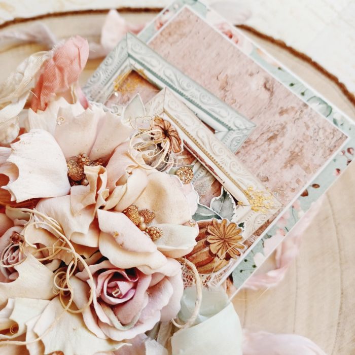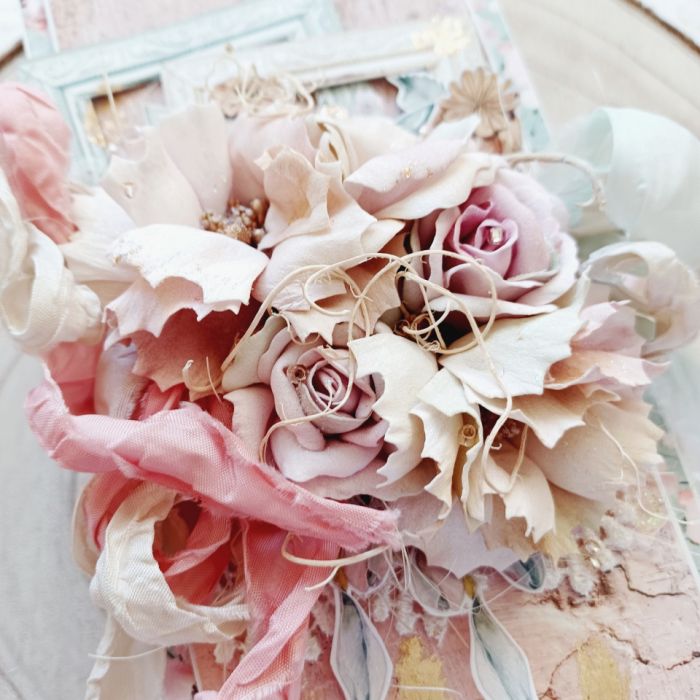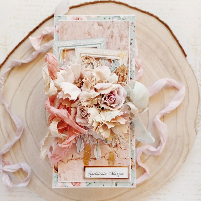Oto zjawiskowa, ręcznie robiona kartka okolicznościowa, idealna, by złożyć życzenia Spełnienia Marzeń na każdą okazję – Urodziny, Imieniny, czy Dzień Kobiet. Projekt, utrzymany w stylu vintage i shabby chic, bazuje na ciepłej palecie kolorystycznej (pudrowy róż, beż, ecru). Centralnym elementem jest niezwykle bogaty, przestrzenny bukiet z ręcznie formowanych kwiatów, uzupełniony detalami ram i złotych akcentów. To ekskluzywna pamiątka wykonana techniką scrapbooking, którą znajdziesz na Artillo.