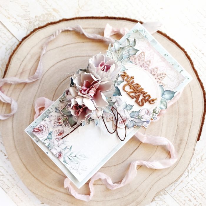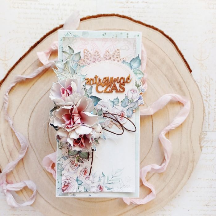 Ręcznie robiona, pionowa kartka w formacie DL, która urzeka subtelnością i romantyczną estetyką. Delikatna kolorystyka – chłodna mięta, pudrowy róż i biel – w połączeniu z bogatą kompozycją kwiatów i ażurowym, drewnianym napisem „Zatrzymać Czas” sprawiają, że to idealny podarunek na Ślub, Rocznicę Ślubu, Zaręczyny lub Walentynki. Jej smukły kształt jest wyjątkowo elegancki.