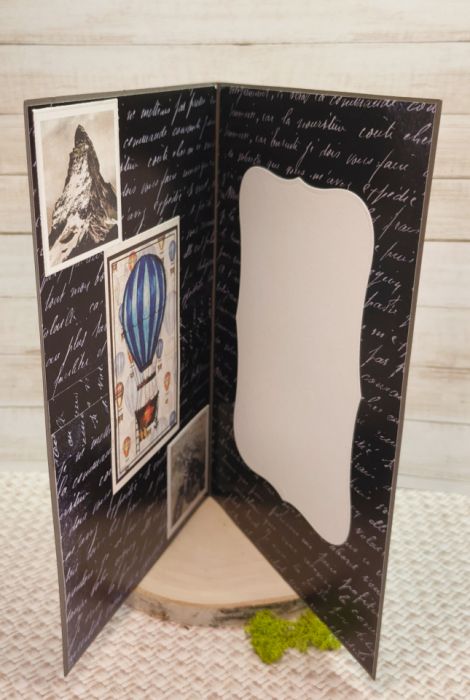Kartka wykonana z dbałością o detale, z wykorzystaniem techniki scrapbookingu, co nadaje jej efektowną wielowarstwowość.