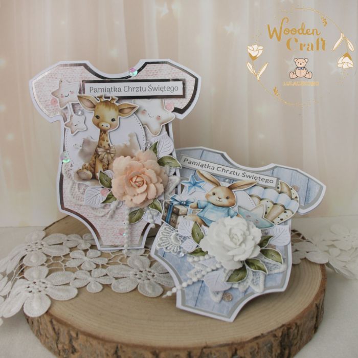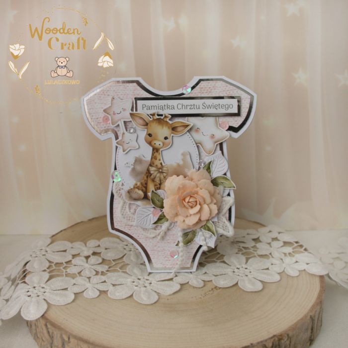 Urocza i nietuzinkowa kartka z okazji Chrztu Świętego, w kształcie dziecięcego body, wykonana z mixu dziecięcych kolekcji papierów, utrzymana w odcieniach bieli, beżu i delikatnego, pudrowego różu, z dodatkiem błyszczących, srebrnych akcentów. Kartka wykonana ręcznie z dbałością o każdy szczegół. Na środku znajduje się grafika słodkiej żyrafki, ozdobiona kompozycją kwiatową z ręcznie robioną różyczką, dodatkowo zdobiona grafikami gwiazdki, balonika i prezentu, kryształkami oraz połyskującymi cekinami, a także napisem "Pamiątka Chrztu Świętego" (na życzenie mogę dodać również imię dziecka, bądź całkowicie zmienić napis na dowolny - w zależności od okazji).