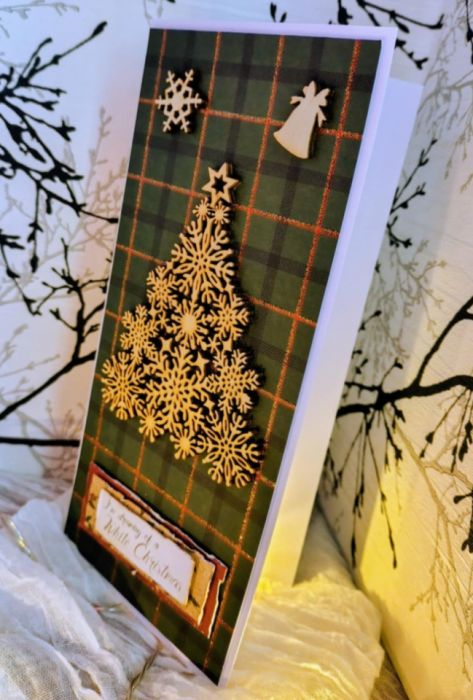 Kartka Bożonarodzeniowa o wym. 10 x 21 cm. Wykonana z materiałów wysokiej jakości. Papier bazowy o gramaturze 250g, papier scrapowy oraz ozdoby ze sklejki. Przepiękna kartka w typowo świątecznym kolorze.