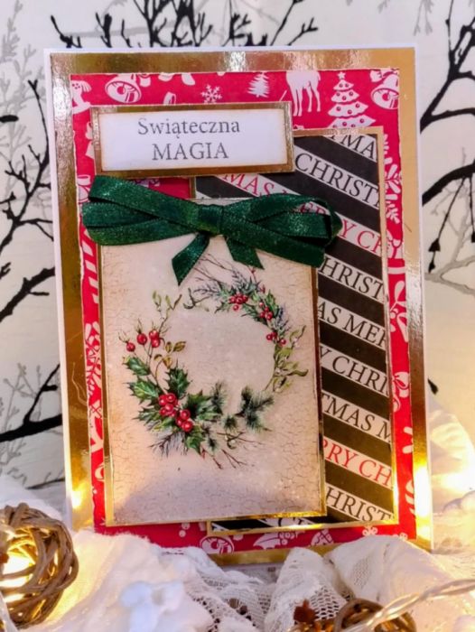 Papier bazowy 250g, papier scrapowy podbijany złotym papierem ozdobnym oraz tagi i kokardka ze wstążki.