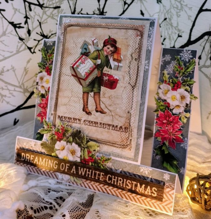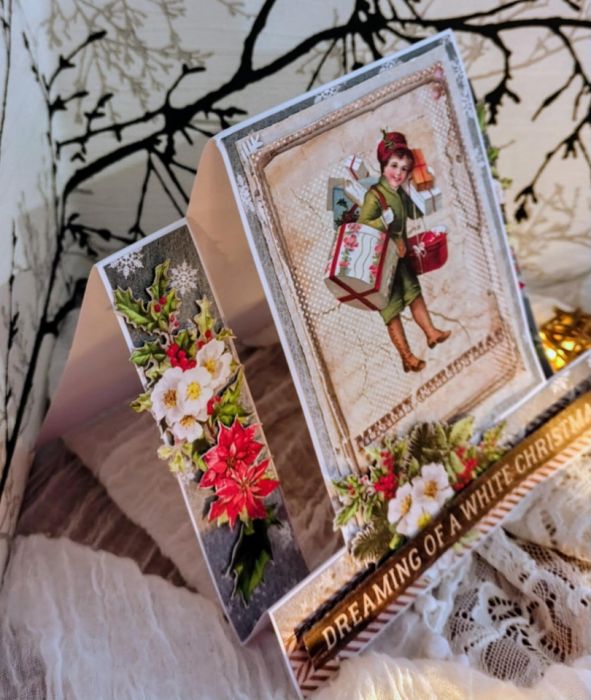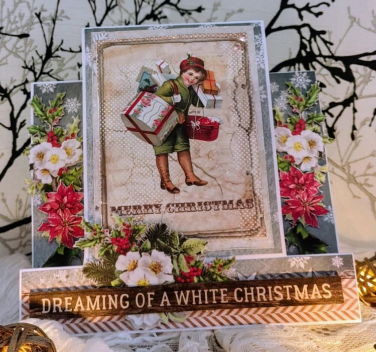 Kartka schodkowa na Boże Narodzenie o wym. 14,5x 14,5cm. Elementy w tej kartce układane są schodkowo co daje wrażenie przestronności.