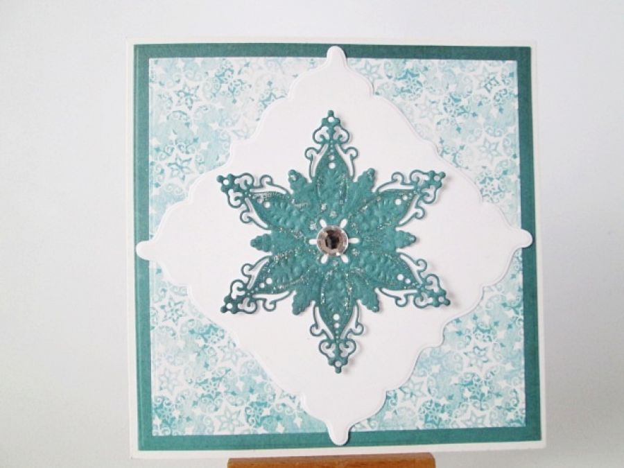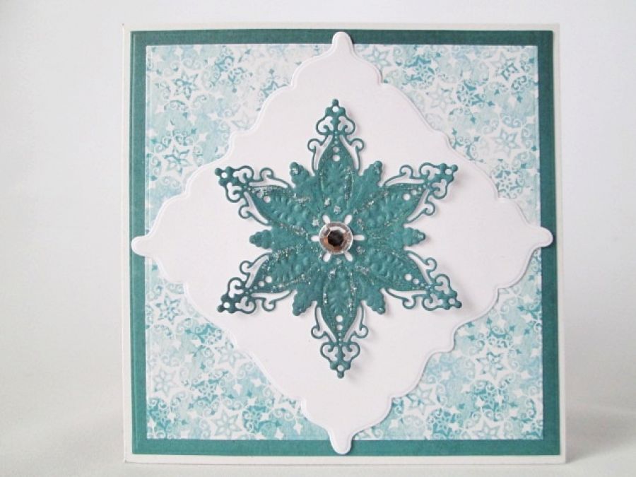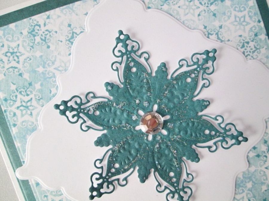 Kartka w całości została wykonana ręcznie. Zdobi ją niezwykle delikatna ażurowa śnieżynka, która została lekko pobrokatowana.