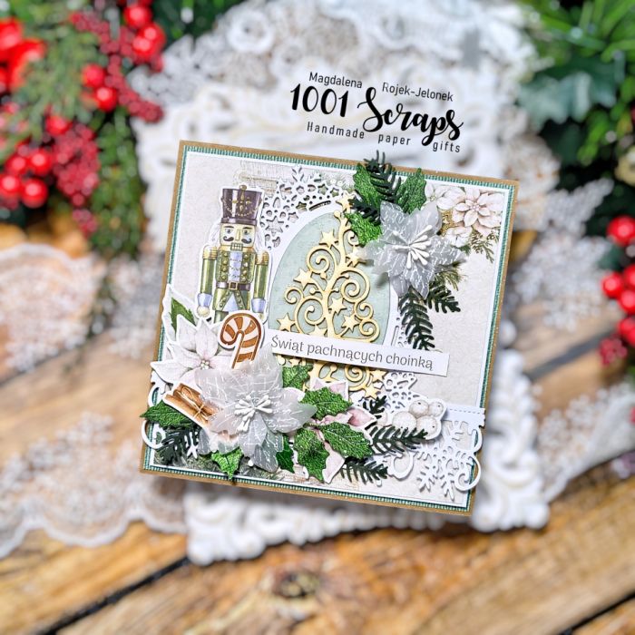 Kartka bożonarodzeniowa w formie kwadratu wykonana z materiałów do scrapbookingu najwyższej jakości. Kartka wykonana w naturalnych kolorach zieleni, beżu oraz bieli. Z frontu zdobi ją bogata kompozycja świąteczna z dziadkiem do orzechów, tekturkową choinką (wykonaną z beermaty) oraz gwiazdami betlejemskimi wykonanymi z kalki. Całość pięknie się komponuje. W środku kartka również oklejona papierami do scrapbookingu, co stanowi piękne tło dla świątecznych życzeń. Przesłane przez klienta życzenia zostaną wydrukowane oraz wklejona w środku kartki. Na życzenie klienta w środku może zostać wklejony biały karnet do samodzielnego wypisania życzeń. Kartka pakowana do pudełka z tzw. okienkiem.