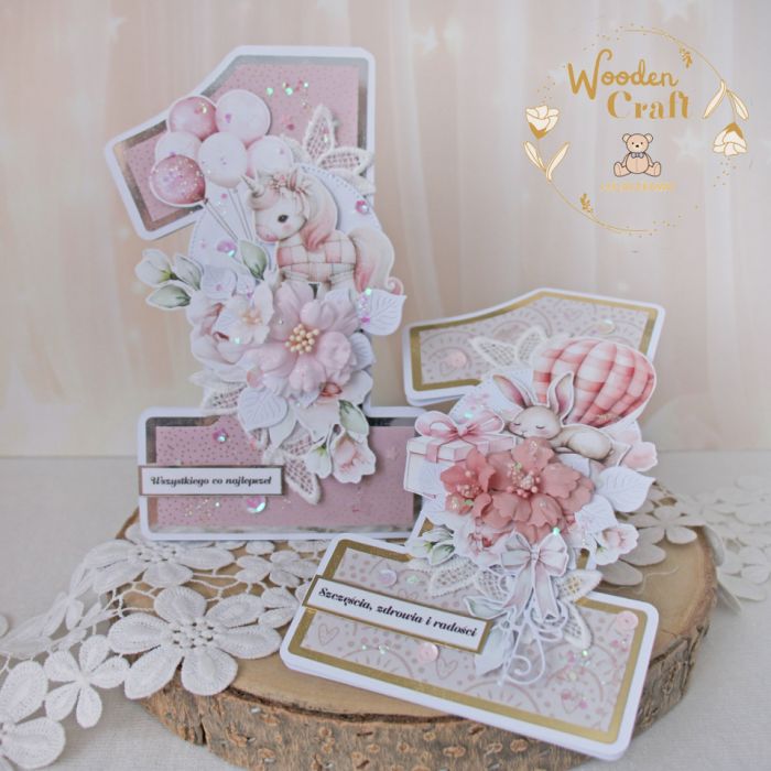 Urocza i nietuzinkowa, dziecięca kartka na roczek, w kształcie cyferki jedynki, wykonana z mixu kolekcji papierów dziecięcych, utrzymana w odcieniach brudnego różu, beżu i bieli z dodatkiem błyszczących, złotych akcentów. Kartka wykonana ręcznie z dbałością o każdy szczegół. Na środku znajduje się grafika uroczego, śpiącego króliczka, ozdobiona kompozycją kwiatową z ręcznie wykonanymi kwiatami, dodatkowo zdobiona cekinami i koronką, połyskującymi drobinkami, a także napisem "Szczęścia, zdrowia i radości" (na życzenie mogę dodać również imię dziecka, lub całkowicie zmienić napis na inny).