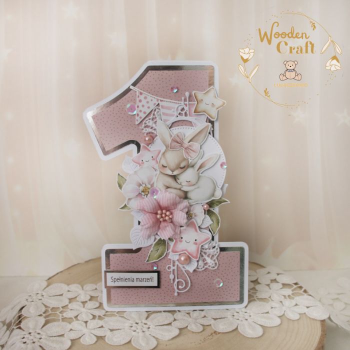 Urocza i nietuzinkowa, dziecięca kartka na roczek, w kształcie cyferki jedynki, wykonana z mixu kolekcji papierów dziecięcych, utrzymana w odcieniach brudnego różu i bieli z dodatkiem błyszczących, srebrnych akcentów. Kartka wykonana ręcznie z dbałością o każdy szczegół. Na środku znajduje się grafika uroczych przytulających się króliczków, ozdobiona kompozycją kwiatową z ręcznie wykonanym kwiatuszkiem, dodatkowo zdobiona cekinami, perełkami i koronką, a także napisem "Spełnienia marzeń" (na życzenie mogę dodać również imię dziecka, lub całkowicie zmienić napis na inny).