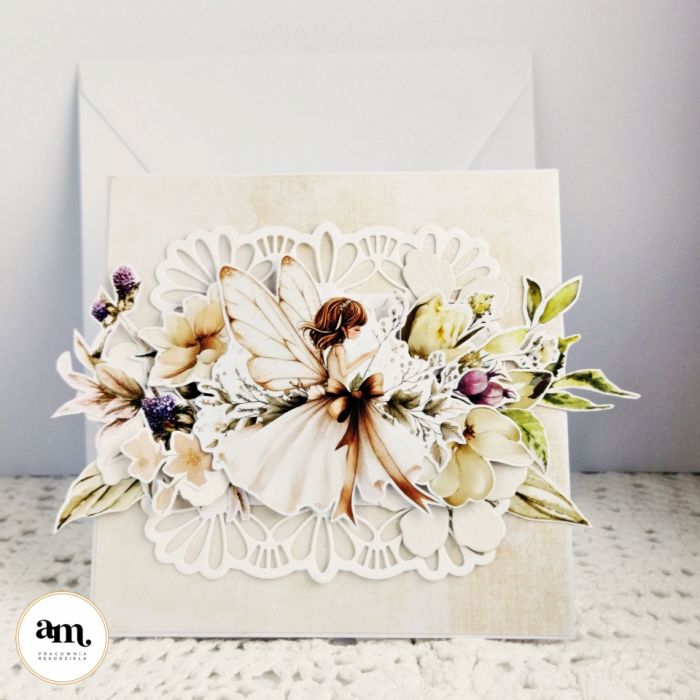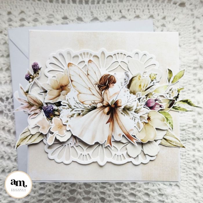 Przedstawiam Wam uroczą urodzinową kartkę dla dziewczynki z motywem wróżki siedzącej pośród kwiatów.