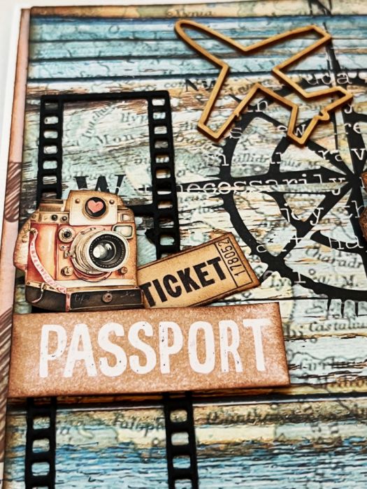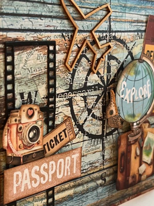 Kartka 15 x 15 na wszystkich stronach oklejona papierem scrapbookingowym, bezkwasowym. Na przodzie kartki naklejone atrakcyjne elementy mające związek z podróżami, z papieru oraz grubej tektury. U dołu zostawiłam miejsce na personalizację. Można wpisać tekst " 15 rocznica wspólnej podróży przez życie" , " Dla Jacka - szalonego podróżnika"itp.