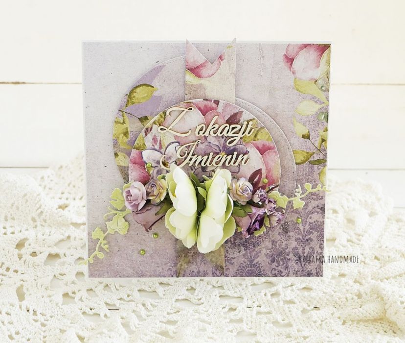 Kartka imieninowa w eleganckich fioletach i wrzosach. Ozdobiona tekturowymi elementami i papierowymi kwiatami.