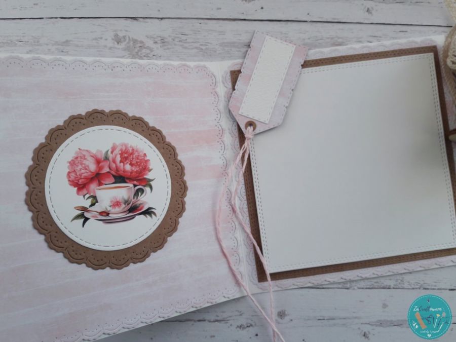 Ręcznie robiona kartka imieninowa z piwoniami wykonana metodą scrapbookingu z wykorzystaniem profesjonalnych materiałów i z dbałością o każdy szczegół.