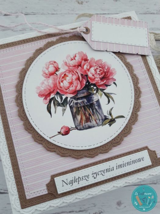 Ręcznie robiona kartka imieninowa z piwoniami wykonana metodą scrapbookingu z wykorzystaniem profesjonalnych materiałów i z dbałością o każdy szczegół.