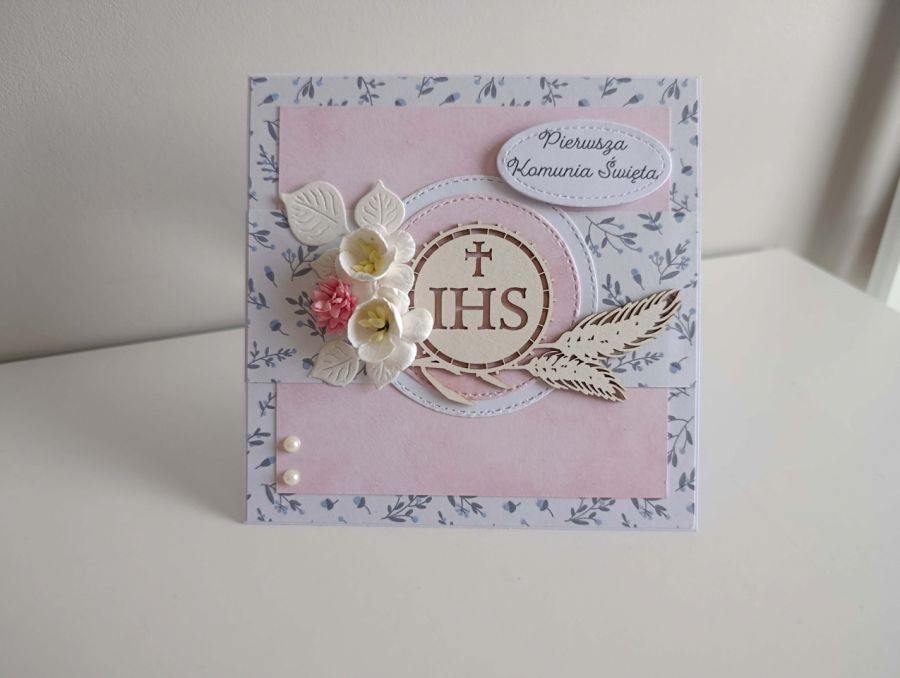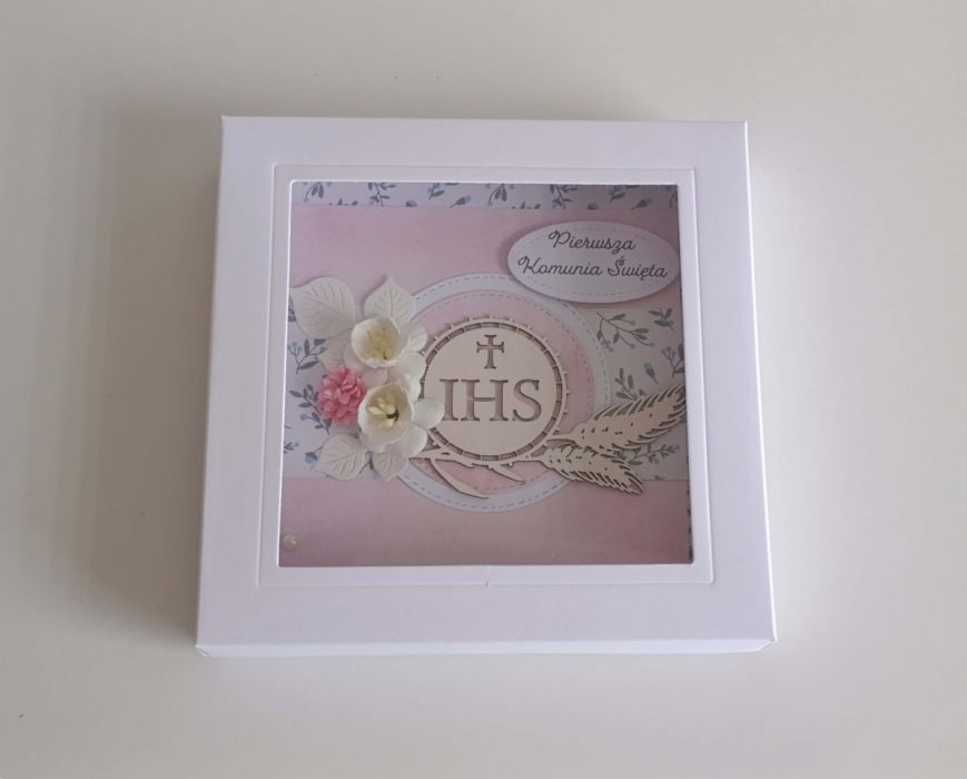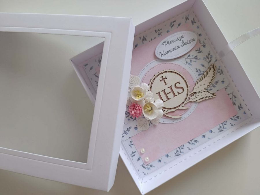 Kartka z okazji Komunii Świętej wraz z białym pudeleczkiem z okienkiem.