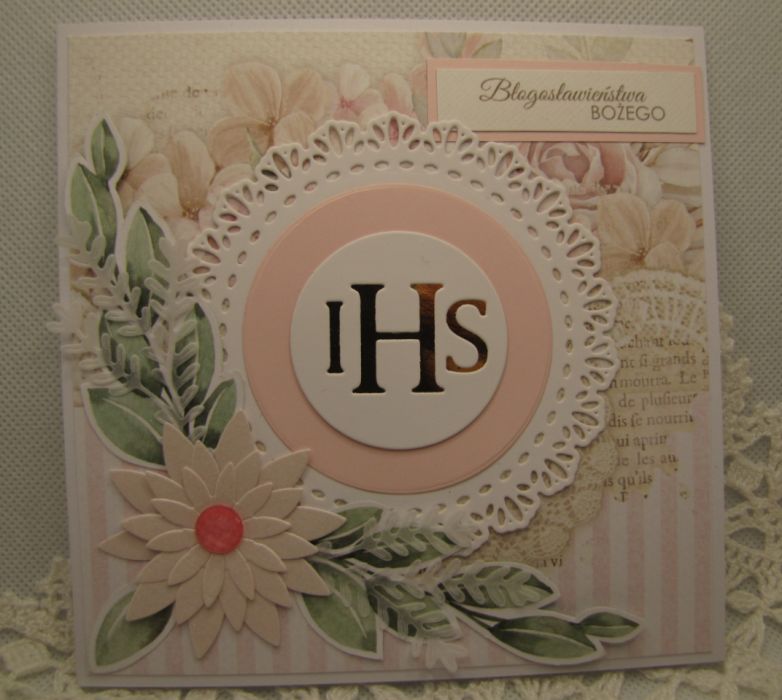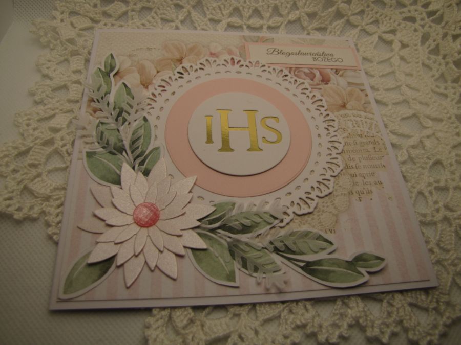 Delikatna, pastelowa kartka na Komunię. Starannie wykonana z wysokiej jakości papierów i dodatków. Wewnątrz pusta - miejsce na życzenie, ale mogę na prośbę kupującego takie życzenia wydrukować i wkleić. Wymiary kartki 13,5x13,5cm. Do kartki dołączona pasująca koperta.