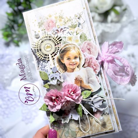 Pionowa kartka komunijna otwierana do boku z kieszonką na banknoty w środku. Wiązana na piękną różową wstążkę. Kartka na froncie zdobiona wizerunkiem komunijnej dziewczynki oraz ręcznie wykonanymi kwiatami z bawełny. Utrzymana w delikatnych kolorach różu i beżu. W środku miejsce na życzenia (przesłane przez klienta lub wklejany jest biały karnet do wypisania życzeń odręcznie). Kartka pakowana do białego pudełeczka z tzw. okienkiem