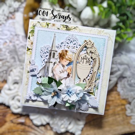 Kartka komunijna dla chłopczyka w kolorach beżu i niebieskiego. Kartka otwierana do boku, kwadratowa, wykonana na bazie białej. Front kartki zdobi wizerunek chłopczyka komunijnego, grawerowna i bogato zdobiona tekturka komunijna oraz ręcznie wykonane kwiaty z bawełny. W środku kartka oklejona papierami do scrapbookingu. Możliwość wklejenia wydrukowanych życzeń (przesyłanych przez klienta) lub białego karnetu do własnoręcznego wypisania życzeń. Kartka pakowana do białego pudełeczka z tzw. okienkiem.