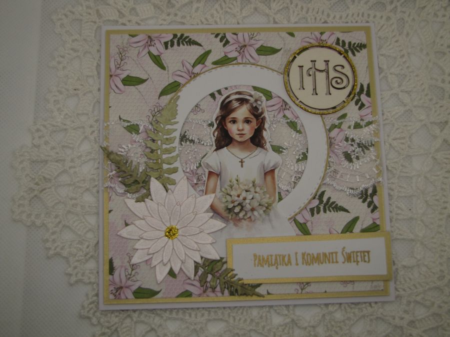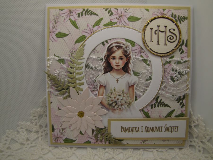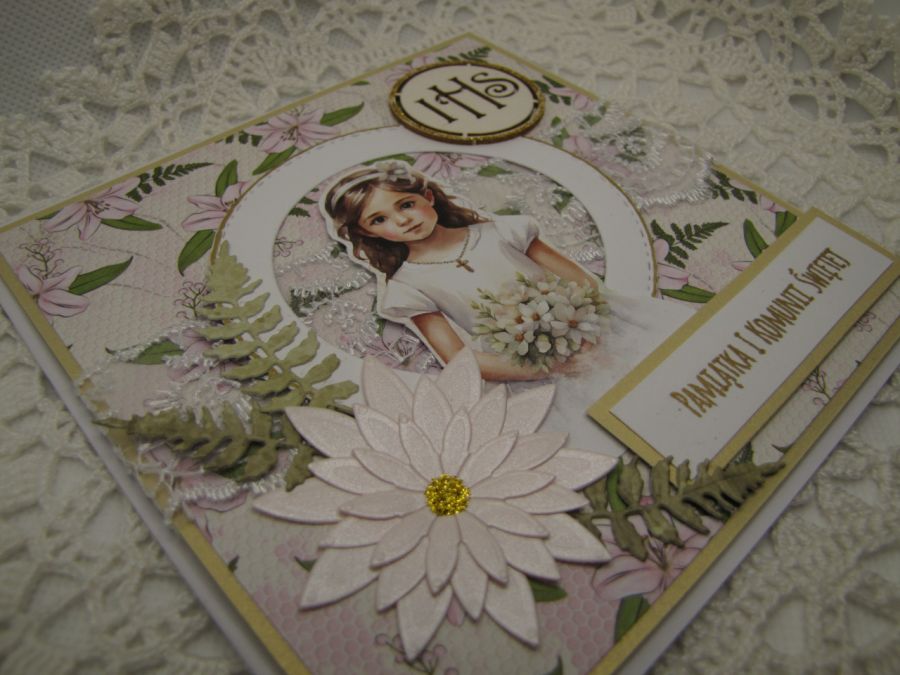 Kartka na Komunię dla dziewczynki. Starannie wykonana z wysokiej jakości papierów i dodatków. Wewnątrz pusta - miejsce na życzenie, ale mogę na prośbę kupującego takie życzenia wydrukować i wkleić. Wymiary kartki 13,5x13,5cm. Do kartki dołączona pasująca koperta.