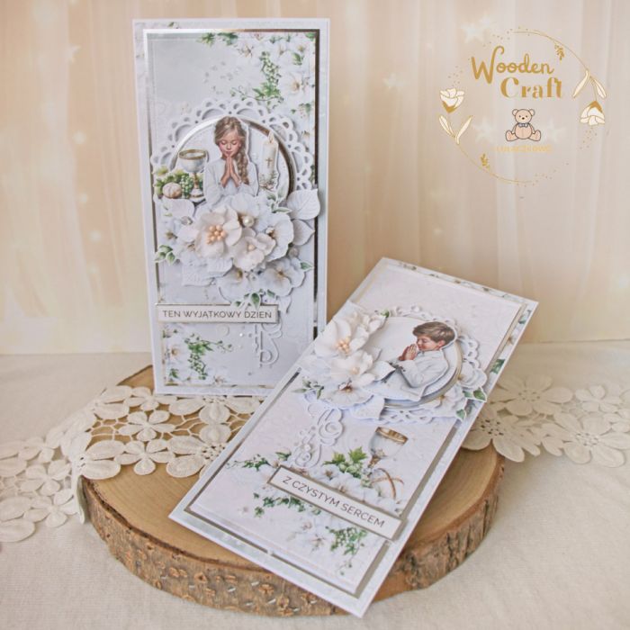 Piękna i elegancka pamiątka Pierwszej Komunii Świętej zamknięta w białym pudełeczku z okienkiem, wykonana ręcznie z najwyższą starannością, z cudownej i delikatnej kolekcji papierów "Holy Communion 4", utrzymana w odcieniach bieli oraz zieleni z dodatkiem srebrnych, błyszczących akcentów. Na środku kartki umieszona została grafika modlącego się chłopca komunijnego, ozdobiona kompozycją kwiatową z ręcznie robionymi kwiatami, udekorowana kryształkami oraz napisem "Z Czystym Sercem"
