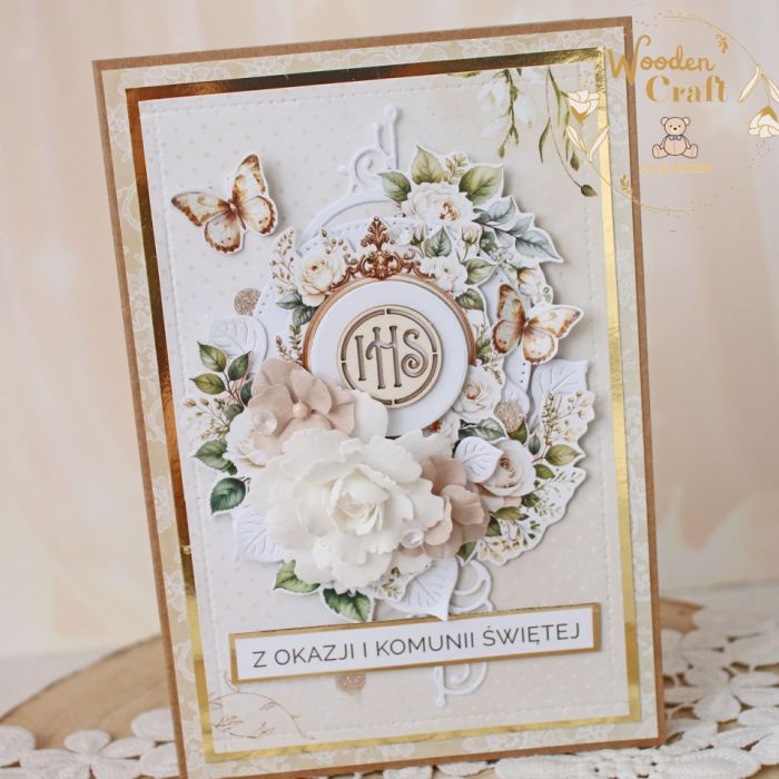 Bogato zdobiona i elegancka pamiątka Pierwszej Komunii Świętej zamknięta w białym pudełeczku z okienkiem, wykonana ręcznie z najwyższą starannością na bazie w kolorze kraft, z cudownej i delikatnej kolekcji papierów "Simple Story", utrzymana w odcieniach delikatnego beżu, zgaszonej zieleni oraz bieli z dodatkiem złotych, błyszczących akcentów. Na środku kartki umieszona została tekturka hostii świętej, ozdobiona kompozycją kwiatową z ręcznie robionymi kwiatami, udekorowana cekinami, kryształkami, motylkami oraz napisem "Z okazji Komunii Świętej"- do napisu mogę również dodać imię dziecka lub całkowicie zmienić go na inny.