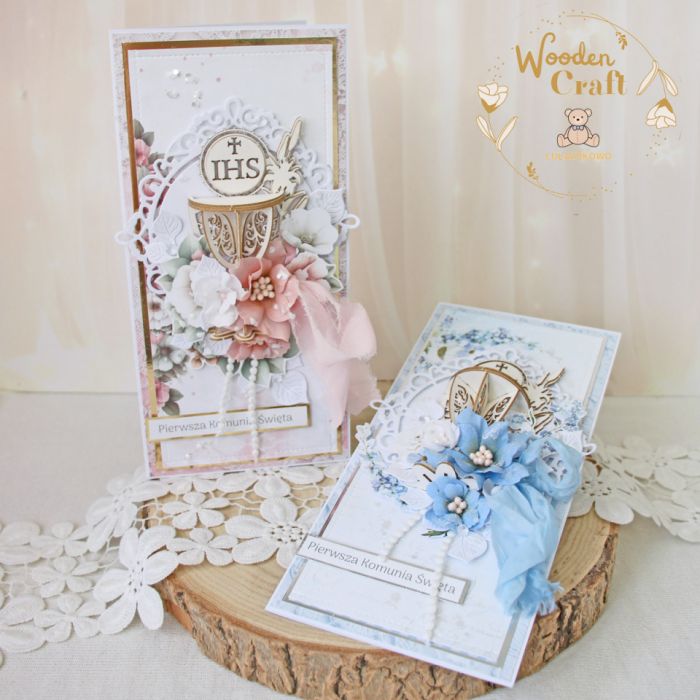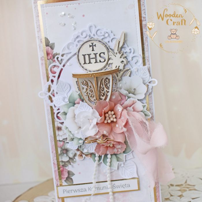 Piękna i elegancka pamiątka Pierwszej Komunii Świętej zamknięta w białym pudełeczku z okienkiem, wykonana ręcznie z najwyższą starannością, z cudownej i delikatnej kolekcji papierów "Lovely Day in Pink", utrzymana w odcieniach różu i bieli z dodatkiem złotych, błyszczących akcentów, z trójwymiarową tekturką - kielichem z hostią świętą. Hostia Święta, ozdobiona kompozycją kwiatową z ręcznie robionymi kwiatami, udekorowana kryształkami, kokardą oraz napisem "Pierwsza Komunia Święta"