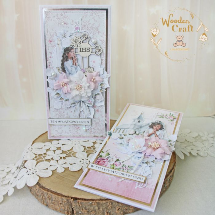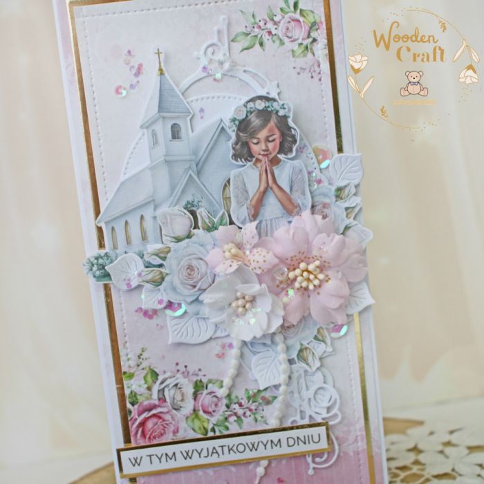 Piękna i elegancka pamiątka Pierwszej Komunii Świętej zamknięta w białym pudełeczku z okienkiem, wykonana ręcznie z najwyższą starannością, z cudownej i delikatnej kolekcji papierów "Pink Roses", utrzymana w odcieniach różu, bieli oraz zieleni z dodatkiem złotych, błyszczących akcentów. Na środku kartki umieszona została grafika modlącej się dziewczynki komunijnej na tle kościółka, ozdobiona kompozycją kwiatową z ręcznie robionymi kwiatami, udekorowana kryształkami, połyskującymi drobinkami oraz napisem "W Tym Wyjątkowym Dniu"