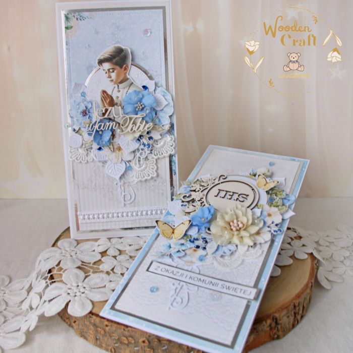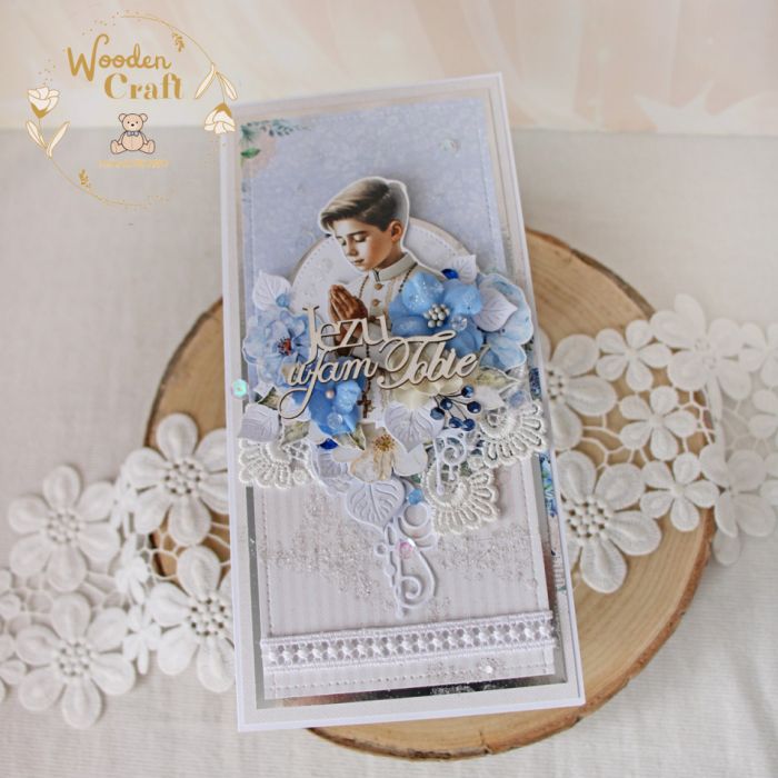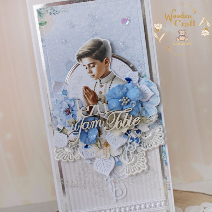 Piękna i elegancka pamiątka Pierwszej Komunii Świętej zamknięta w białym pudełeczku z okienkiem, wykonana ręcznie z najwyższą starannością, z cudownej i delikatnej kolekcji papierów "Sapphire Days", utrzymana w odcieniach delikatnego błękitu, beżu oraz bieli z dodatkiem srebrnych, błyszczących akcentów. Na środku kartki umieszona została grafika modlącego się chłopca komunijnego, ozdobiona kompozycją kwiatową z ręcznie robionymi kwiatami, udekorowana koronką, kryształkami oraz tekturkowym napisem "Jezu ufam Tobie".