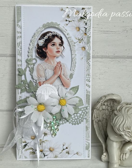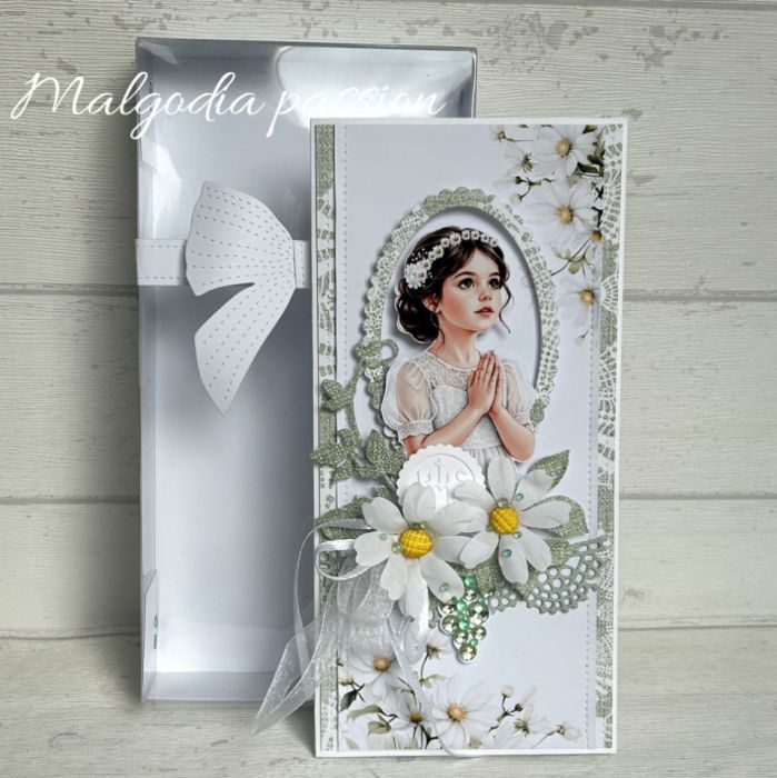 Piękna, ręcznie robiona kartka z wysokiej jakości materiałów papierniczych ozdobiona obrazkiem uroczej dziewczynki, perełkami , Hostyjką, ręcznie robionymi kwiatami i wstążkami. Wewnątrz ozdobione miejsce na wpis życzeń. Kartka w białym, dopasowanym pudełku z szybką ozdobioną kokardą.