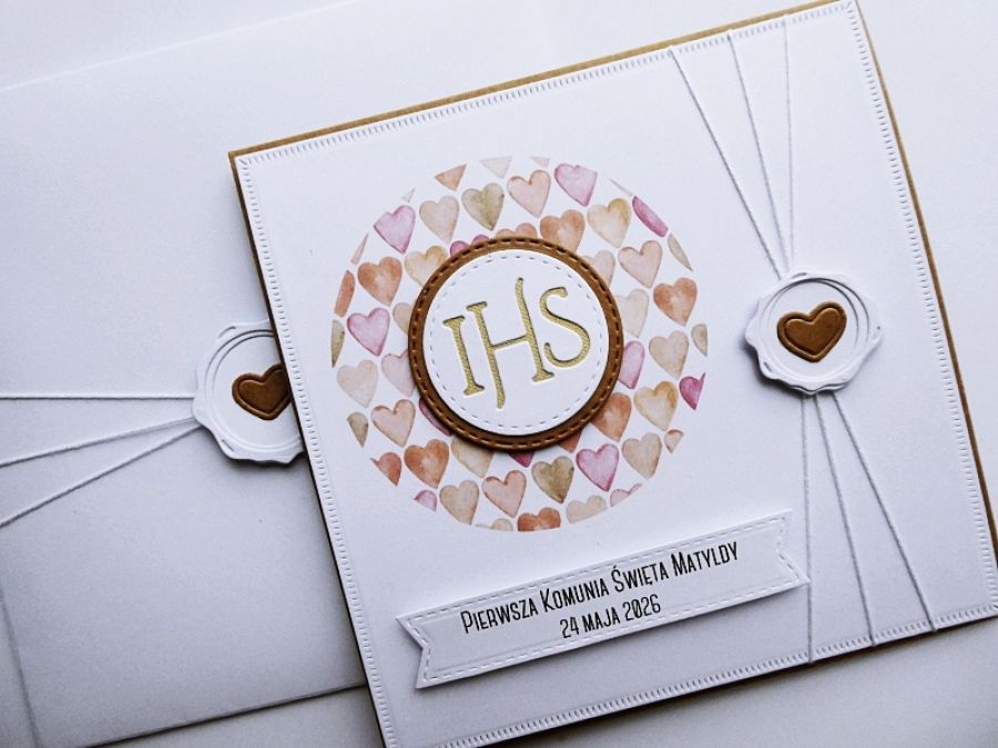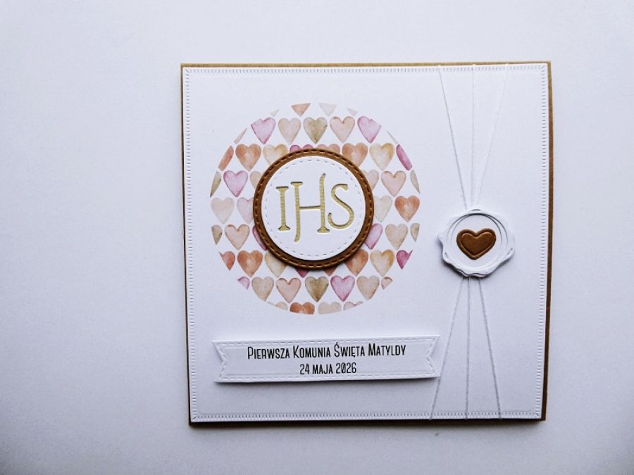 Zadaj pytanie dotyczące produktu: Kartka komunijna ręcznie robiona z serduszkami
