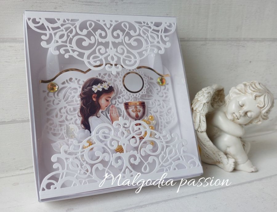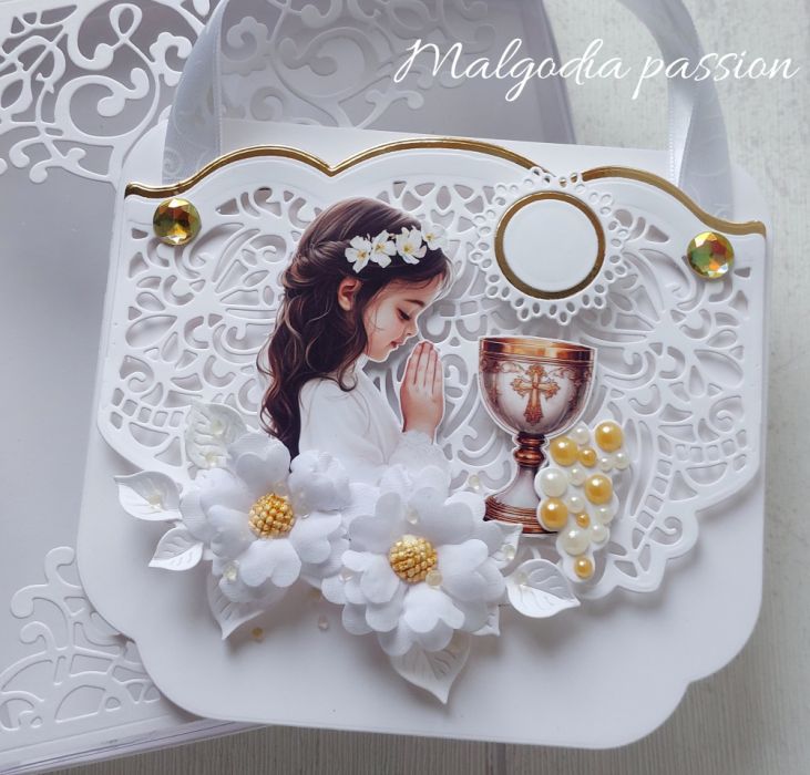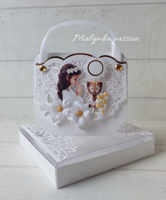 Niepowtarzalna, składana kartka gratulacyjna z okazji Pierwszej Komunii Świętej w kształcie torebki w oryginalnym pudełeczku z przeźroczystą pokrywką. Autorski projekt produktu. Kartka jest ozdobiona ręcznie robionymi kwiatkami i obrazkiem z uroczą dziewczynką. Wykonana z dokładnością i starannością o szczegóły z wysokiej jakości papierów w bieli z odrobiną złota. Wewnątrz znajduje się miejsce na wpis życzeń i kieszonka. Torebeczka posiada uchwyt ze wstążeczki .
