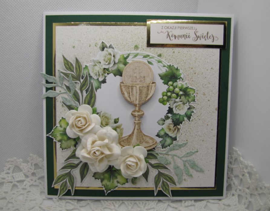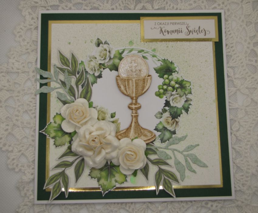 Kartka komunijna bogato zdobiona. Wykonana z najwyższej jakości papierów scrapbookingowych i dodatków - w tym ślicznych, przestrzennych papierowych kwiatów. Kartka z dodatkiem złotego błysku :) Wewnątrz ozdobna wkładka na życzenia - mogę też takie życzenia wydrukować i wkleić na prośbę kupującego - proszę to podać w uwagach do zamówienia.
