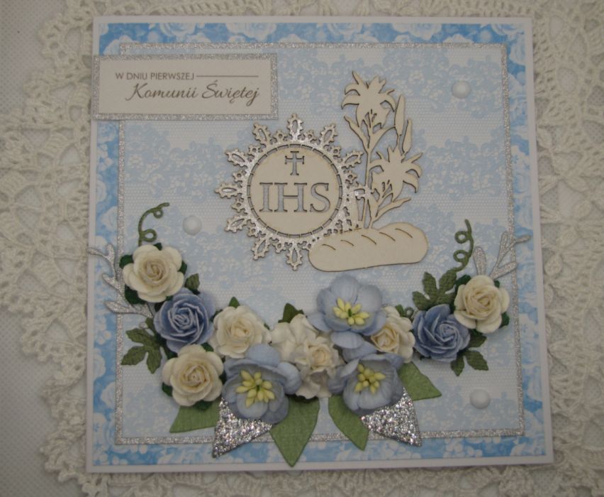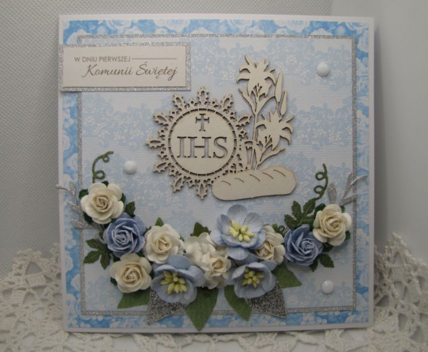 Kartka komunijna bogato zdobiona, w niebieskiej tonacji. Wykonana z najwyższej jakości papierów scrapbookingowych i dodatków - w tym ślicznych, przestrzennych papierowych kwiatów. Kartka z dodatkiem srebrnego błysku :) Wewnątrz ozdobna wkładka na życzenia - mogę też takie życzenia wydrukować i wkleić na prośbę kupującego - proszę to podać w uwagach do zamówienia.