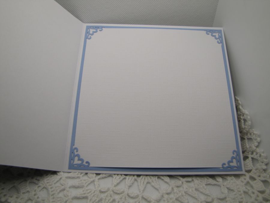 Kartka ma wymiary 14,5x14,5cm i i jest umieszczona w białym pudełku z okienkiem, które ładnie eksponuje kartkę i dodatkowo jest przewiązane satynową białą wstążką. Wymiary pudełka 15x15x2,5cm.