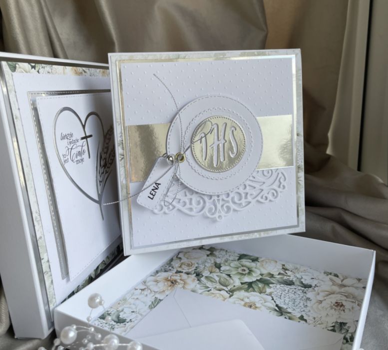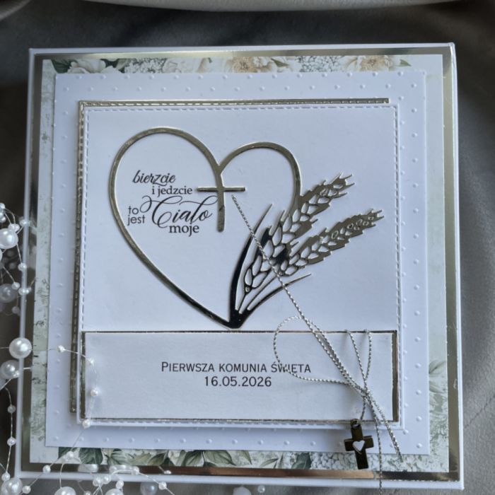 Ręcznie robiona kartka komunijna w eleganckim, białym pudełku z lustrzanymi, srebrnymi akcentami to wyjątkowy zestaw, który idealnie sprawdzi się jako pamiątka Pierwszej Komunii Świętej. Całość wykonana jest z najwyższą starannością, z użyciem wysokiej jakości papierów oraz delikatnych, srebrnych motywów komunijnych, które nadają projektowi nowoczesnej elegancji.