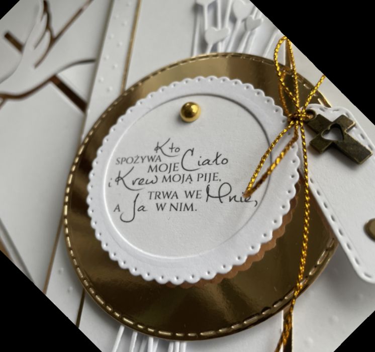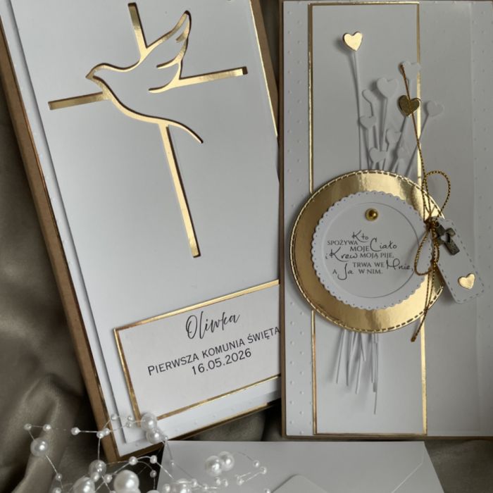 Ręcznie robiona, przestrzenna kartka komunijna w dużym, reprezentacyjnym formacie to wyjątkowy projekt premium, wykonany z wysokiej jakości papierów w odcieniach tłoczonej bieli oraz z eleganckimi dodatkami z lustrzanego złota.