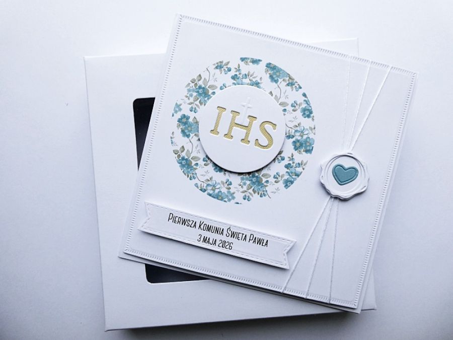 Ręcznie wykonana kartka na Pierwszą Komunię Świętą w komplecie z dekoracyjnym białym pudełkiem - spokojna, ale pełna treści.