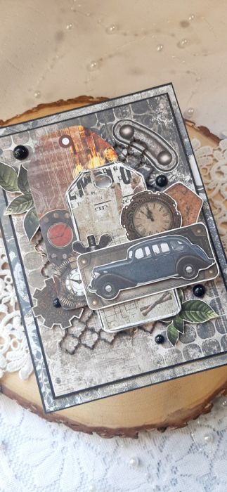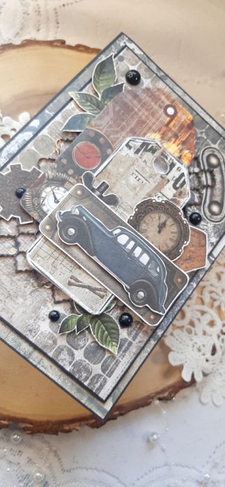Kartka okolicznościowa do pudełka. Kartka jest bogato zdobiona różnymi "męskimi" dodatkami. W środku kartka na życzenia podklejona taśmą dwustronną. Wymiary kartki 18x13 cm. W zestawie z pudełkiem o wymiarach 18,5x13,7x2,5 cm.