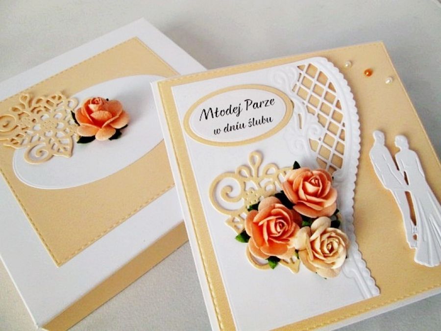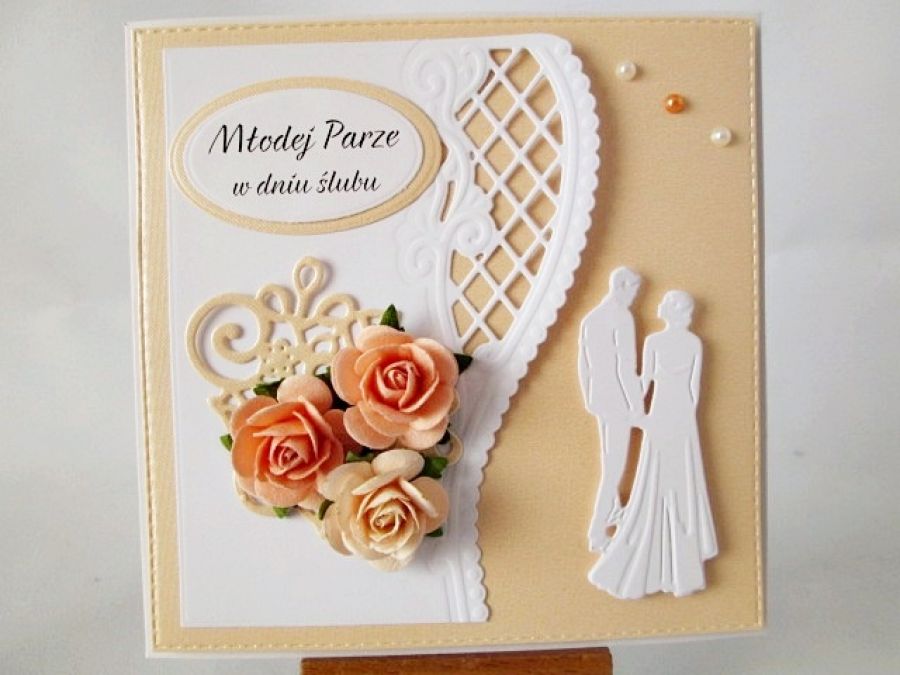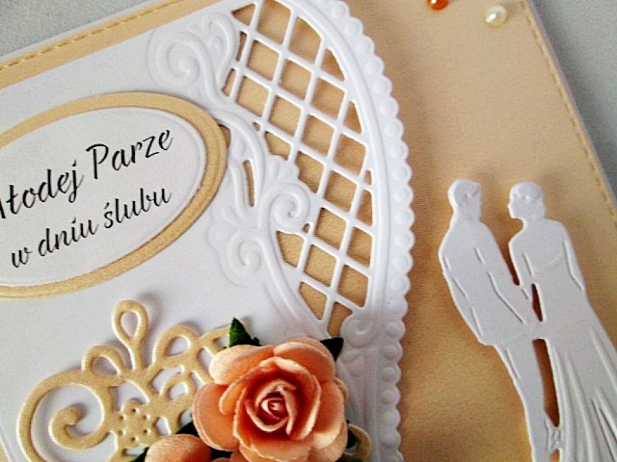 Oryginalna kartka z okazji ślubu utrzymana w brzoskwiniowo-białej tonacji.