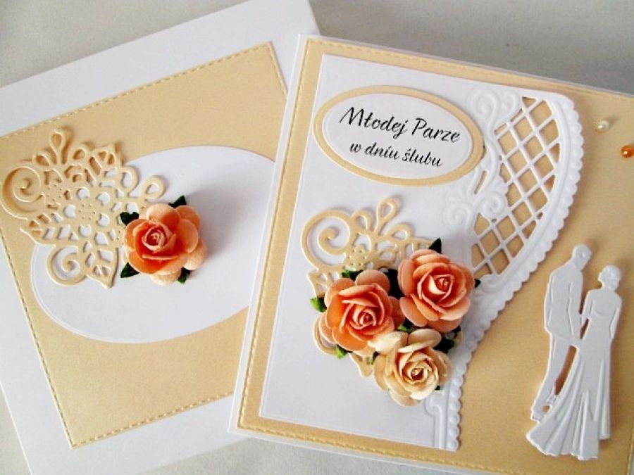 Kartka w całości została wykonana ręcznie. Biała ażurowa wycinanka została przyozdobiona brzoskwiniowymi różami.