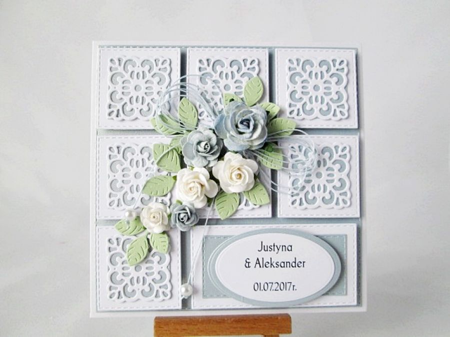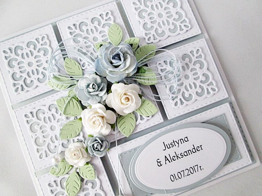 Oryginalna kartka z okazji ślubu utrzymana w srebrzystobłękitnej tonacji.