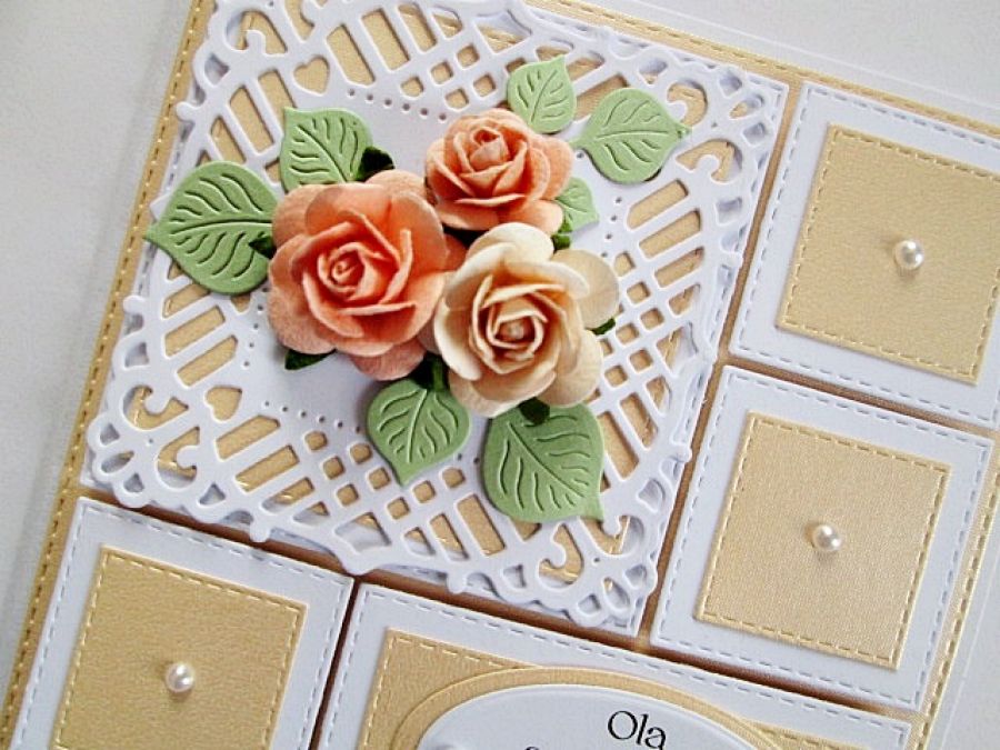 Kartka w całości została wykonana ręcznie. Oryginalne patchworkowe tło zostało ozdobione białą ażurową wycinanką, na której znajduje się subtelny bukiecik morelowych róż. Delikatność kartki podkreślają małe półperełki.