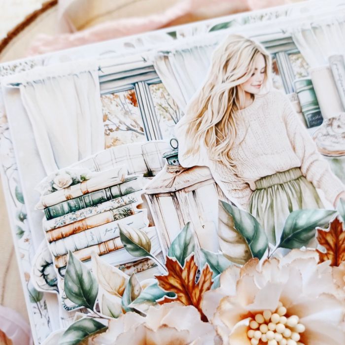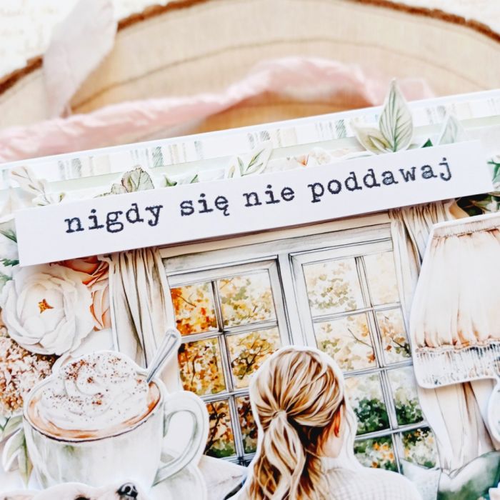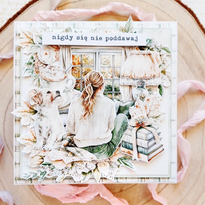 Przedstawiam ręcznie robioną kartkę okolicznościową o kwadratowym formacie, która niesie ze sobą przesłanie otuchy i motywacji. Idealna na prezent pocieszenia, gratulacje za osiągnięcia, Urodziny lub po prostu, by wyrazić wsparcie. Kompozycja wykonana techniką scrapbooking ukazuje przytulny, jesienny motyw (dziewczyna, pies, książki, kawa), który symbolizuje spokój i komfort. Przestrzenne zdobienia 3D w jasnej, beżowo-zielonej palecie nadają jej ciepła i ekskluzywnego charakteru. To unikatowe rękodzieło dostępne na Artillo.