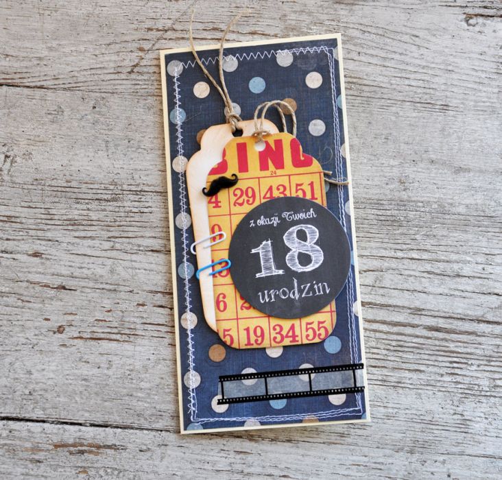 Piękna i wyjątkowa, ręcznie wykonana kartka na 18 Urodziny dla chłopaka; przeszywana maszynowo, z elementami 3D; rozmiar 10x21cm, w komplecie koperta; zapraszam