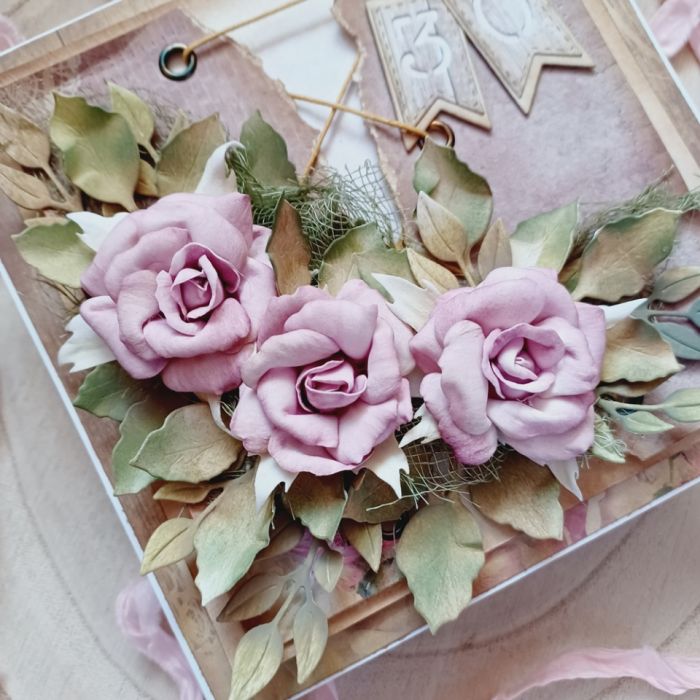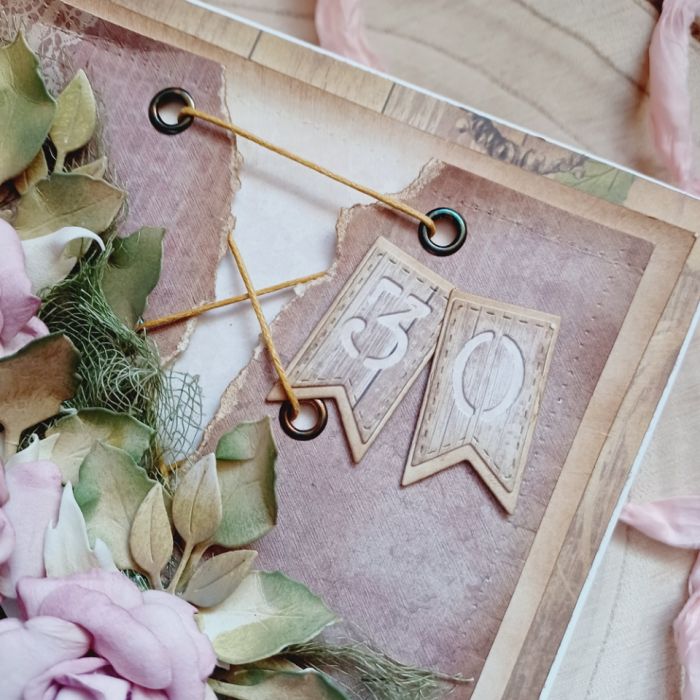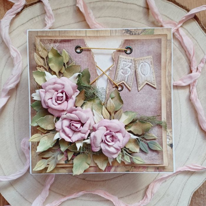 Wyjątkowa, ręcznie wykonana kartka okolicznościowa w stylu vintage, stworzona z myślą o jubileuszu 30-lecia. Wyróżnia się bogatą kompozycją trzech przestrzennych róż w pudrowym różu oraz oryginalnym detalem w formie sznurowanego gorsetu. Całość dopełniają postarzane krawędzie i naturalne, zielone listki.