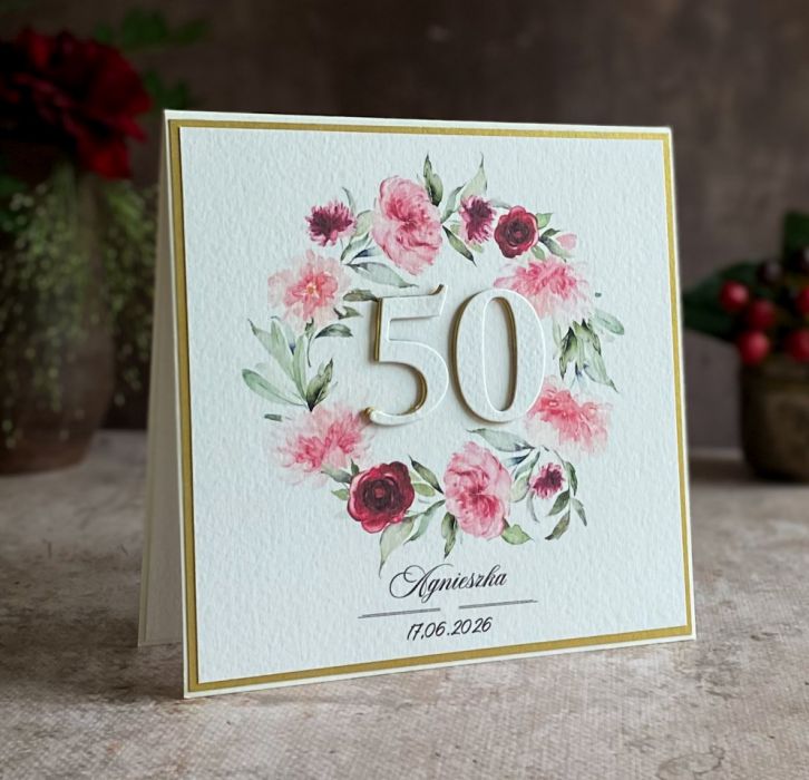 Elegancka, ręcznie wykonana, personalizowana kartka z okazji 50-tych urodzin.